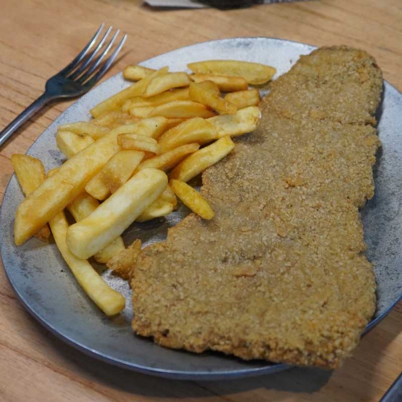Milanesa con salsa cheddar, huevo frito, panceta, verdeo, y guarnición de papas fritas.