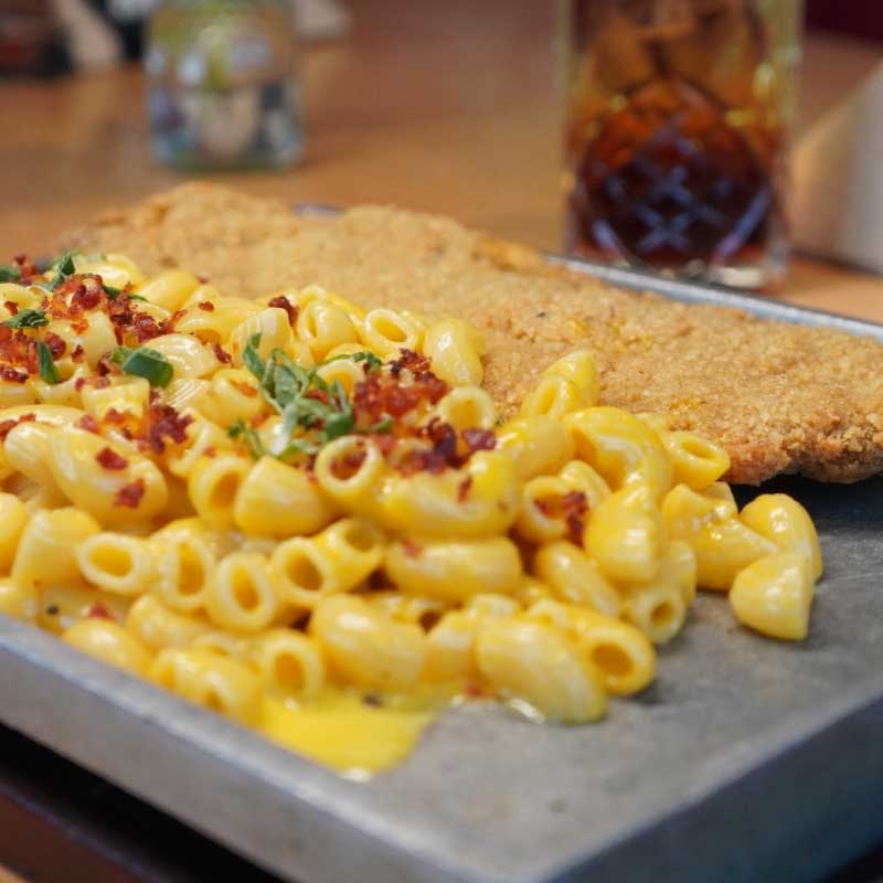 Milanesa con guarnición de fideos, salsa Mac & Cheese, verdeo y panceta.