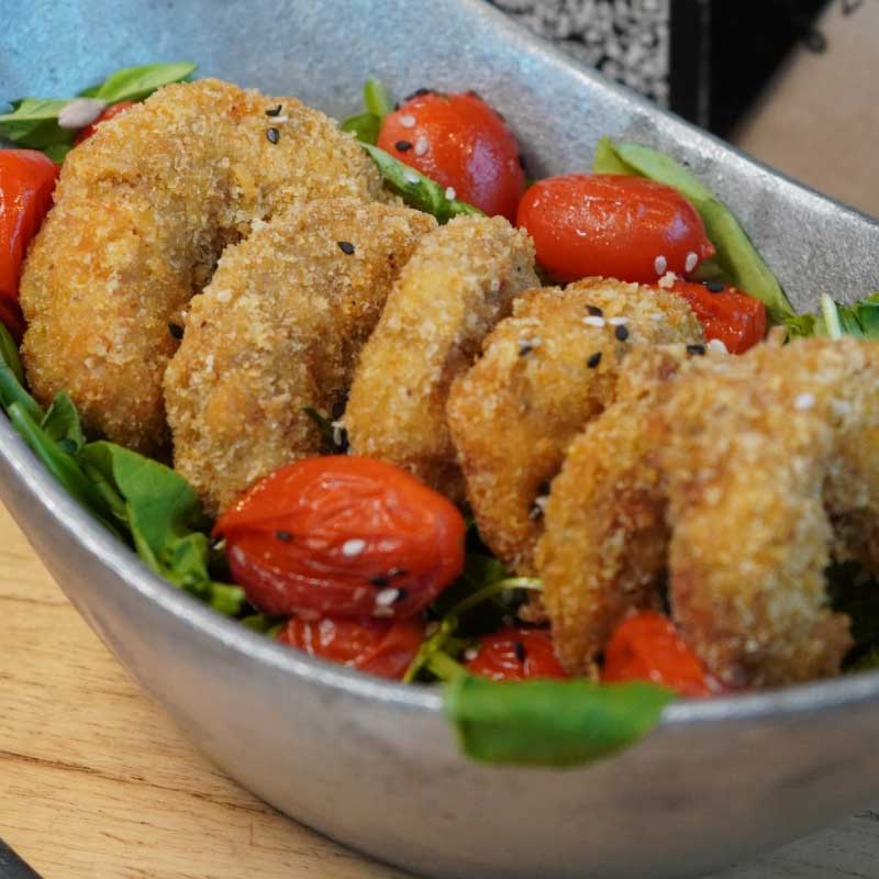 Langostinos rebozados, hojas verdes, cherrys asados y dip de vinagreta.